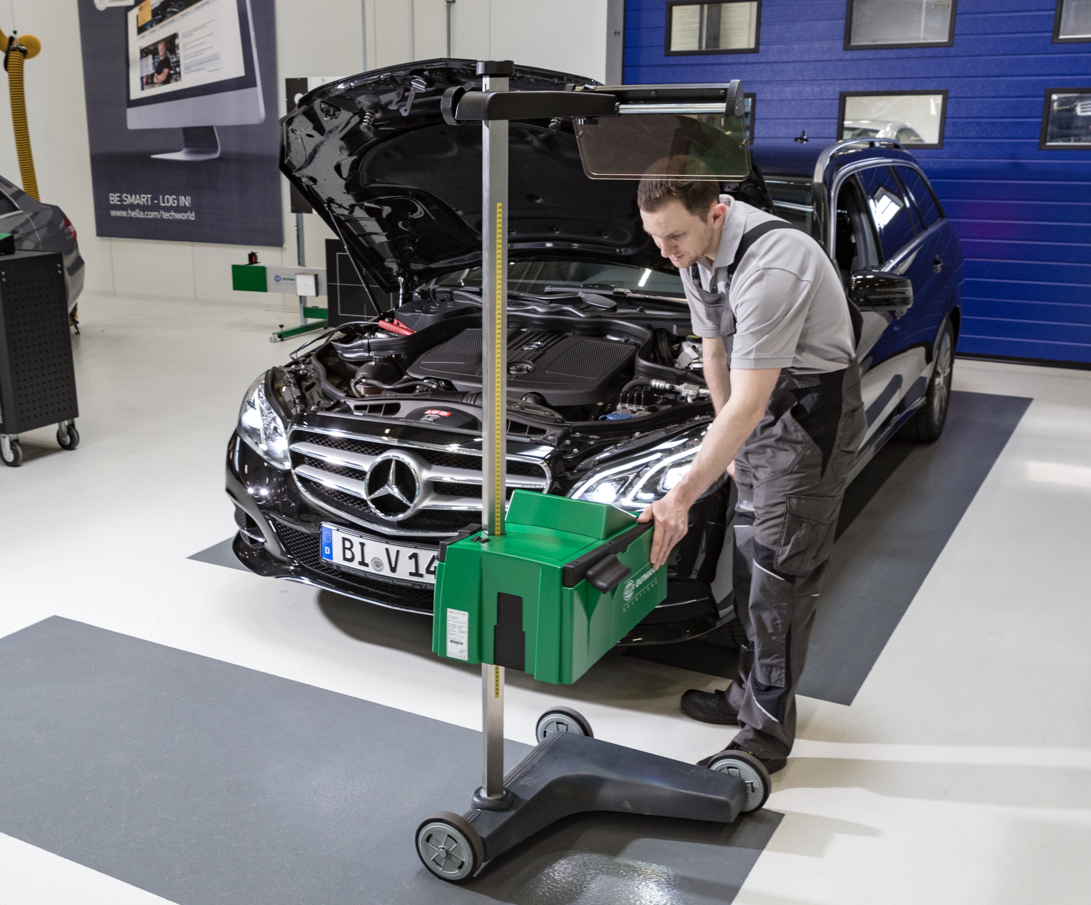 digitale Scheinwerfereinstellgerät SEG V wird über ein serienmäßiges Hybridvisier orthogonal zum Fahrzeug ausgerichtet. Darüber hinaus bietet das kamerabasierte Gerät eine integrierte Fahrzeugdatenbank, die automatische Kompensation von Bodenunebenheiten und -neigung sowie die Möglichkeit zur Dokumentation der Messergebnisse. Das bedienerfreundliche Gerät lässt sich an den verschiedensten Fahrzeugklassen, Scheinwerferarten und Lichtquellen bis hin zu Laserscheinwerfern einsetzen. Es verfügt über alle in dieser Gerätekategorie marktüblichen Funktionen und darüber hinaus eine Hella Gutmann-Besonderheit: Die im SEG V integrierte Datenbank mit fahrzeug- und scheinwerferspezifischen Algorithmen und Solldaten bildet die Basis für eine sichere Auswahl, Kalibrierung und Grundeinstellung von Fernlichtassistenten.